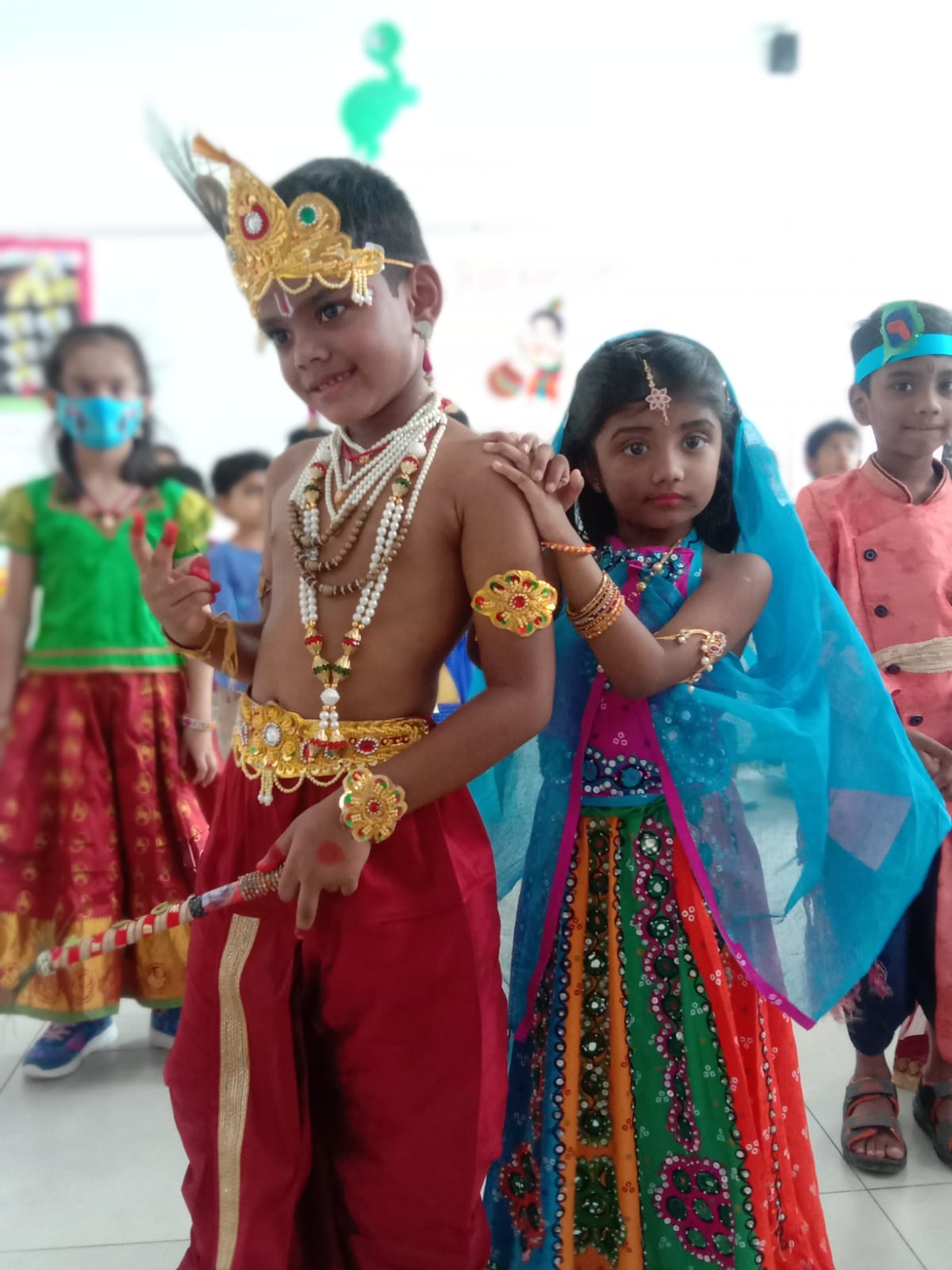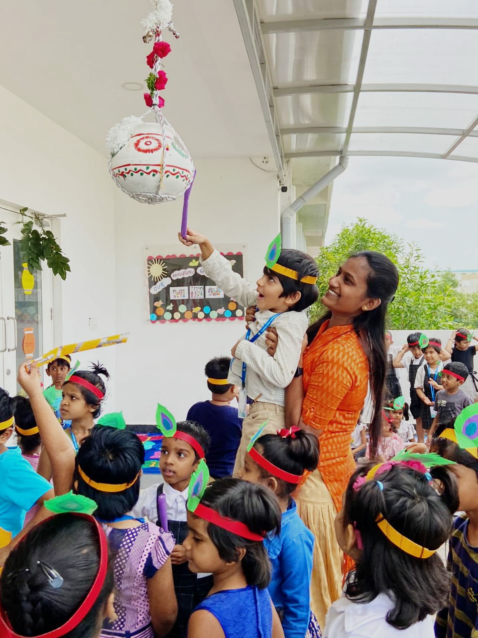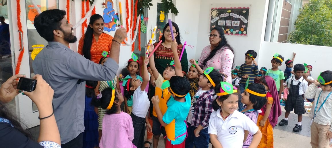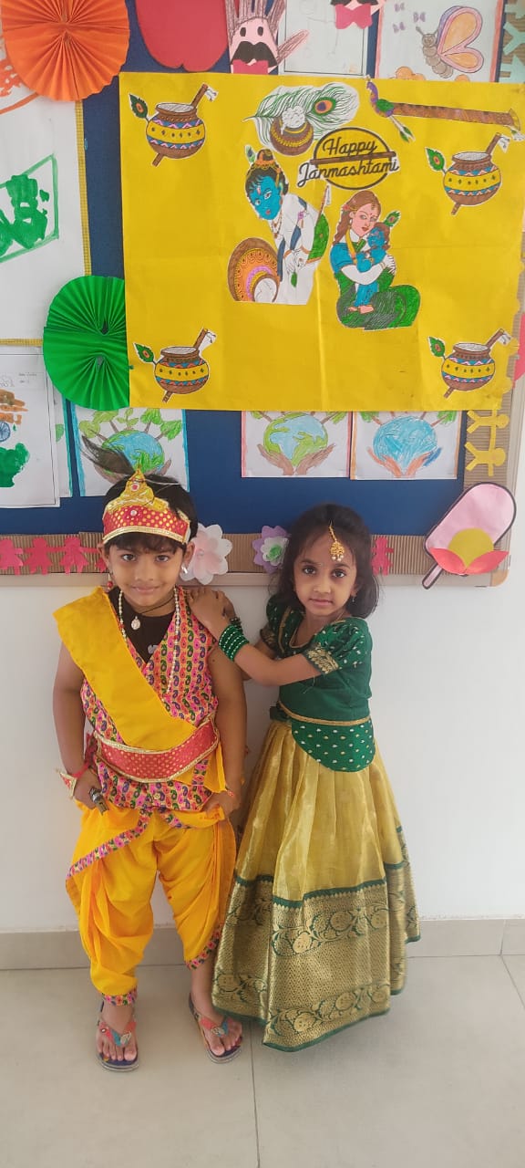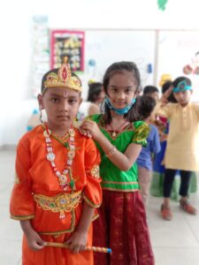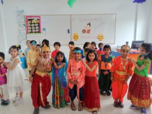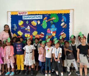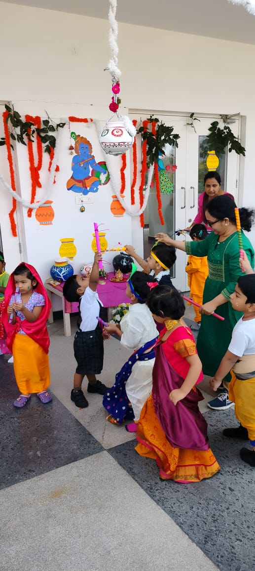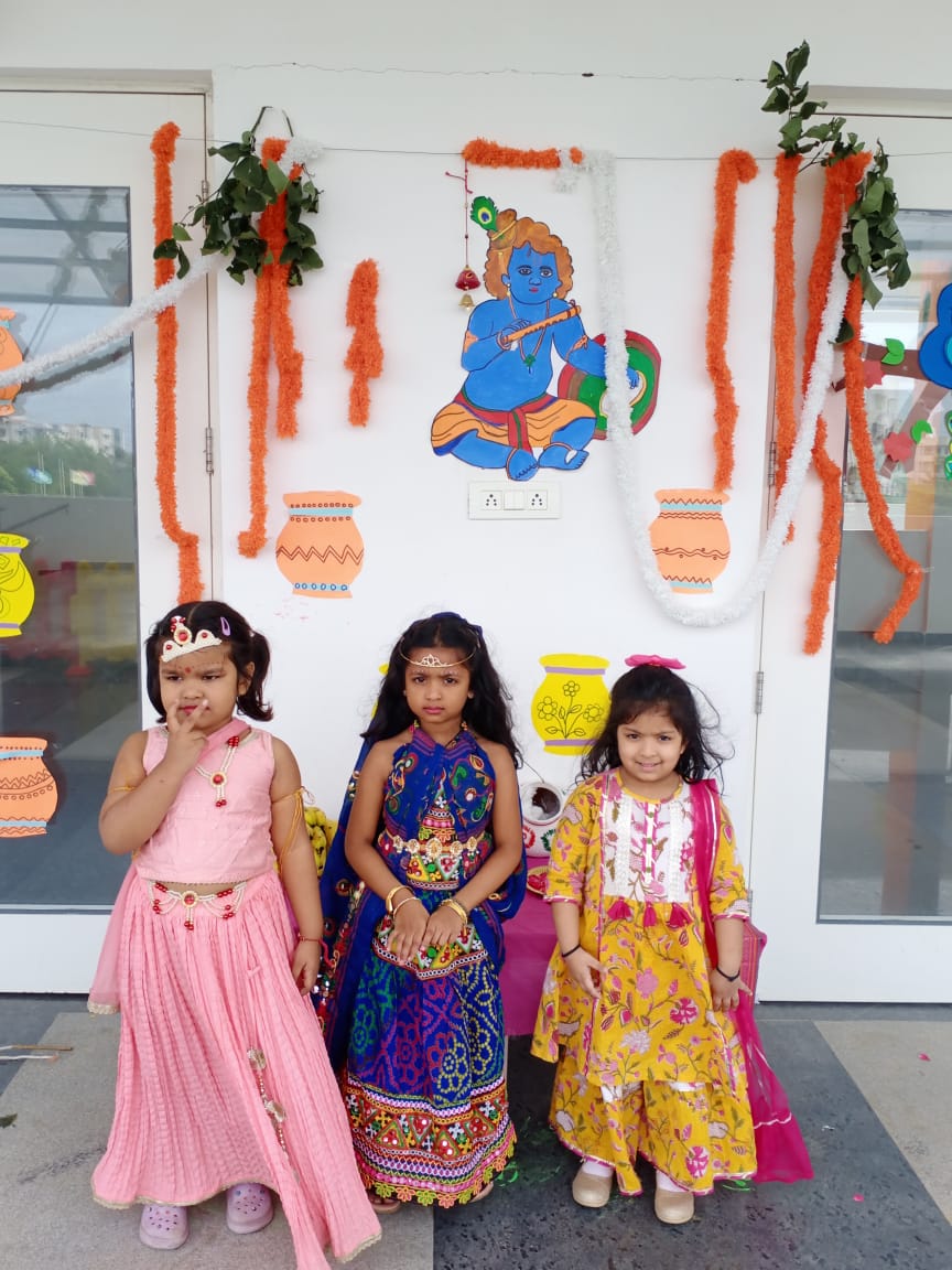 Krishnashtami was celebrated with great pomp and festivity by the tiny-tots of Pre Primary Students were dressed as Radha and Krishna, the cute little ones added a traditional touch to the entire celebrations when they danced to the beat of Janmashtami songs, filling the air with joy and festive spirit.The most significant event of the programme was “ Dahi Handi”, organized separately for boys and girls.children were excited to hit the handi and they enjoyed doing it.